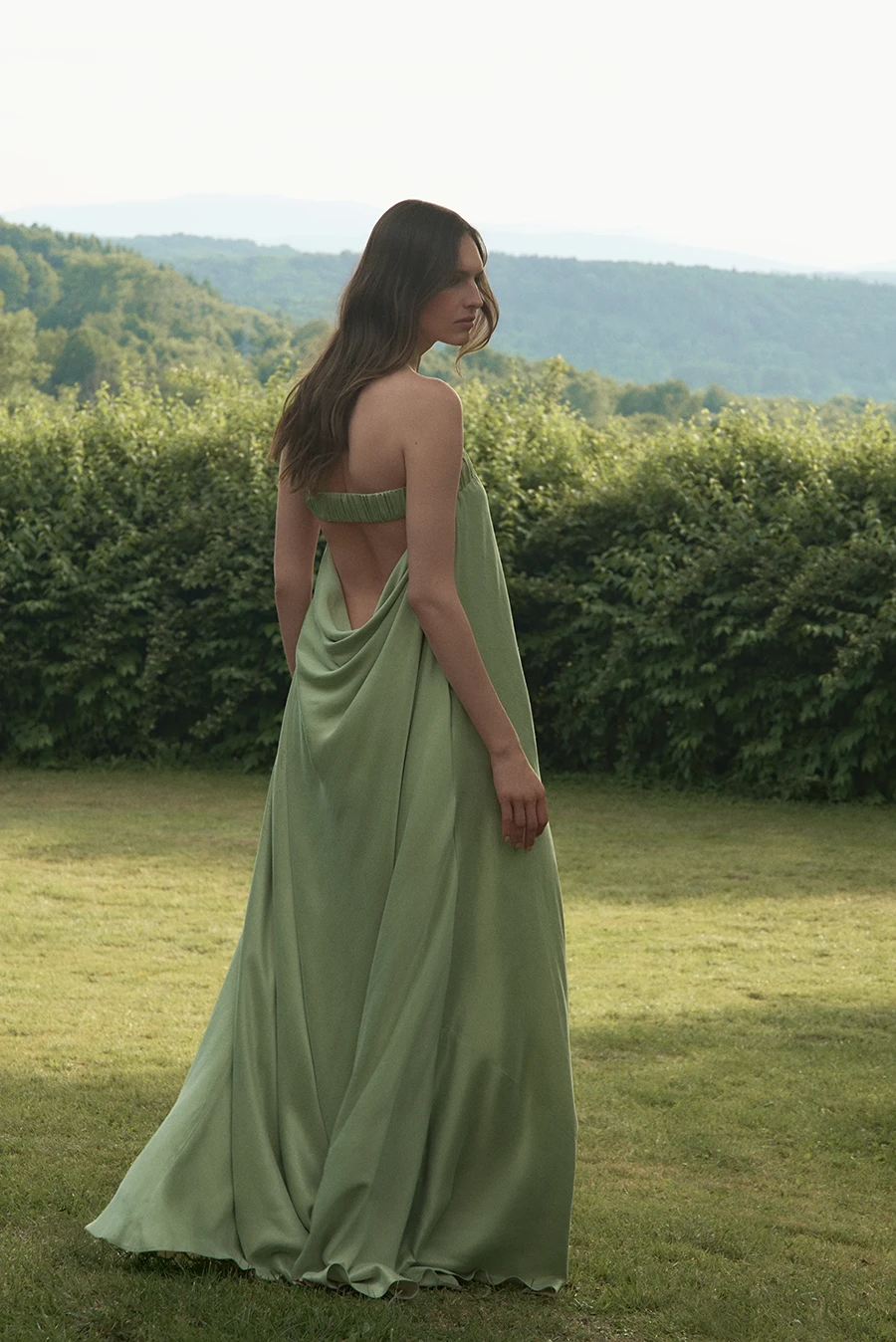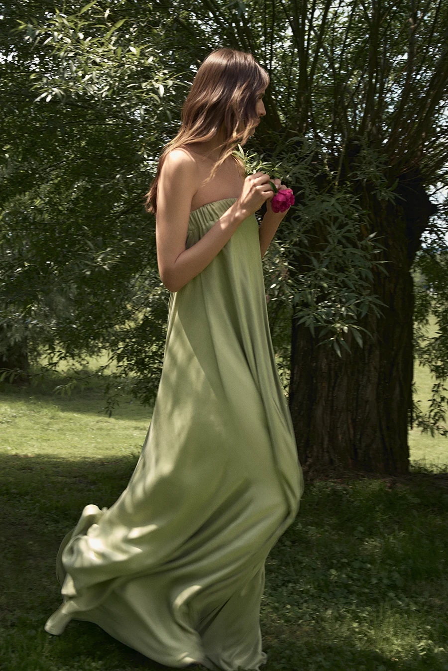 Margo ma luźny krój i długość do ziemi, która pięknie pracuje w ruchu i daje pełną swobodę. Wykonana z mieszanki 58% lyocellu i 42% wiskozy, miękko układa się na ciele i dobrze sprawdza się w cieplejsze dni. Przód pozostaje minimalistyczny i prosty, natomiast tył przyciąga uwagę dekoltem, który subtelnie odsłania plecy. To propozycja na plenerowe uroczystości, letnie przyjęcia i wieczorne wyjścia.