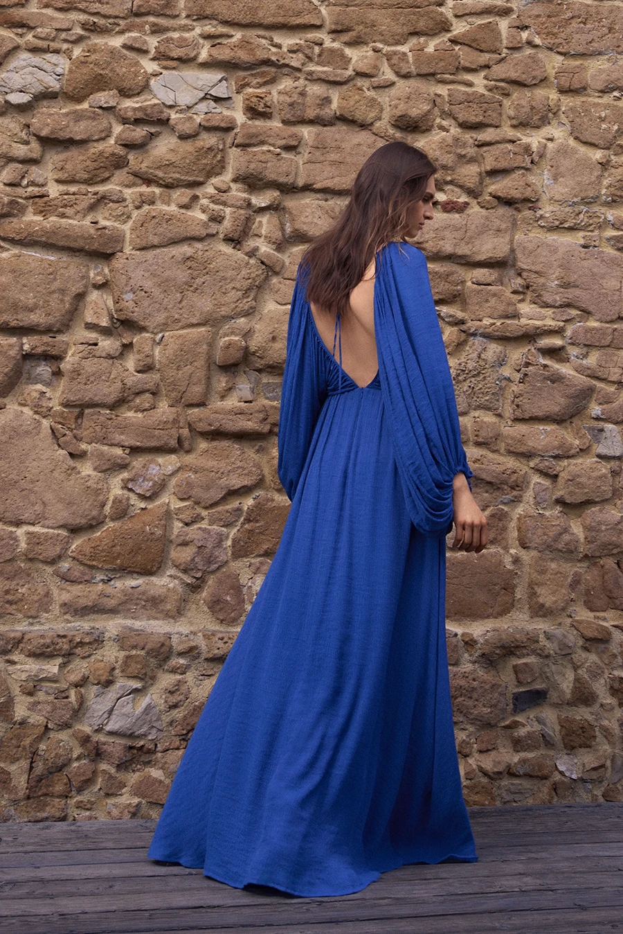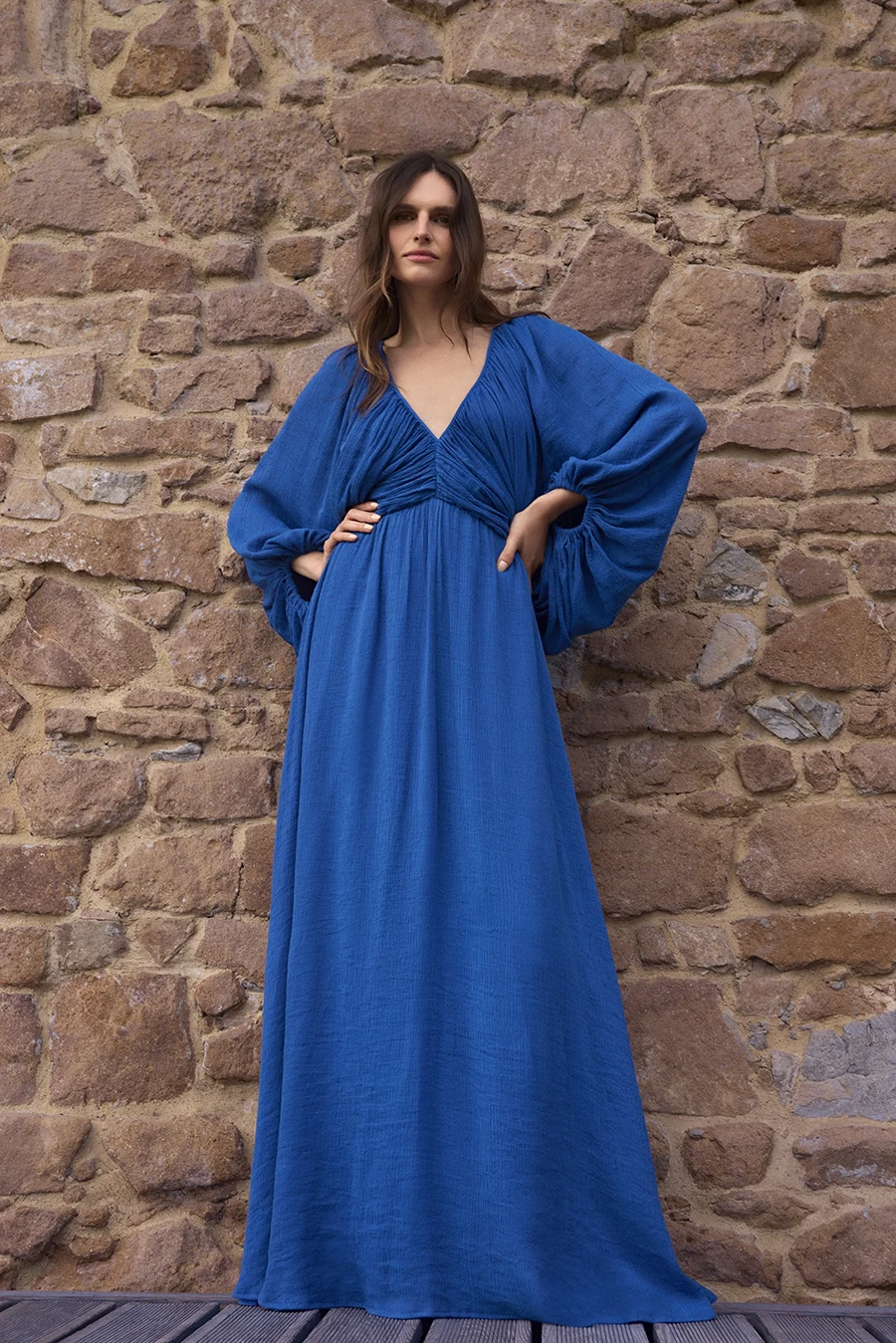 Sukienka maxi o wyrazistej formie, z głębokim dekoltem i dramatycznymi, bufistymi rękawami w intensywnym odcieniu kobaltu.